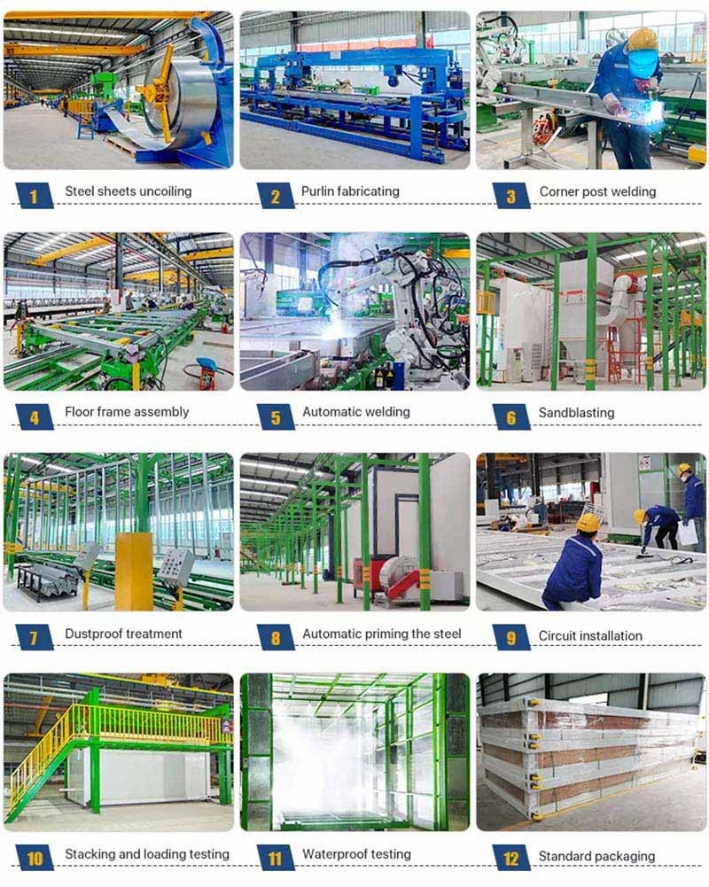 Steel Structure Frame Welded Flat Pack Container House is fast to install. It is easy for moving, transporting and water cleaning. With good water proof, sound-insulated, heat preservation, the container house’s service life can be over 30 years. Customized design is acceptable.
